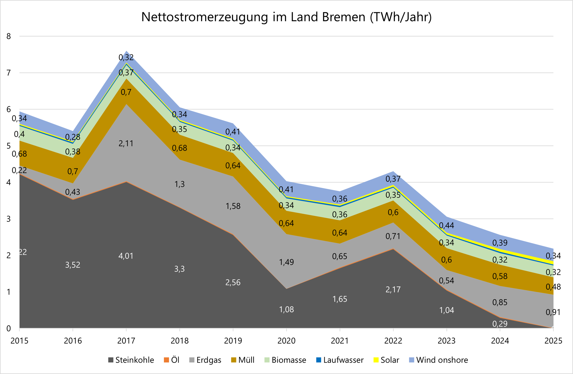 Um die Bedeutung der erneuerbaren Energie in Bremen beurteilen zu können, soll zunächst die gesamte Nettostromerzeugung betrachtet werden.