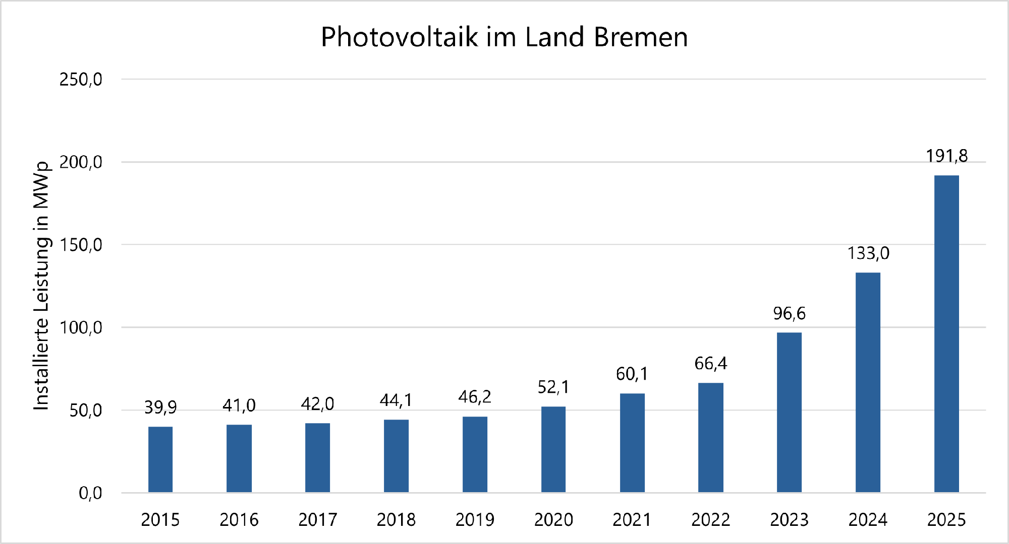 Dargestellt ist hier die im Land Bremen installierte Photovoltaik-Leistung zum Ende der letzten Jahre (Quelle: Markstammdatenregister, Abruf 18.02.2026). Beeindruckend ist der Zubau in den Jahren 2023 bis 2025. Das ist fast eine Verdreifachung der Gesamtleistung in nur drei Jahren!