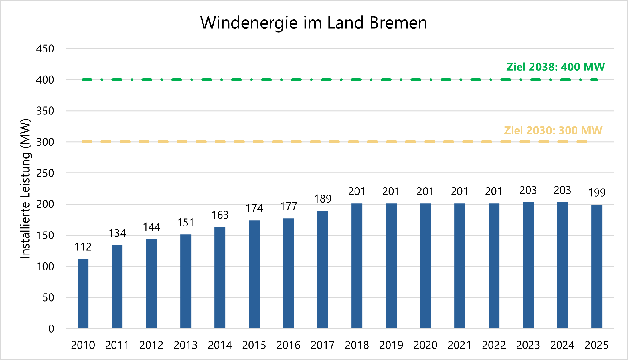 Die Enquetekommission peilt für 2030 einen Ausbau auf 300 MW und für 2038 auf 350 bis 400 MW an (Abschlussbericht der Enquetekommission „Klimaschutzstrategie für das Land Bremen“), S. 26). Die Bundesregierung strebt für Deutschland bis 2030 eine Verdoppelung der Leistung an (EEG 2023, § 4 Ausbaupfad).