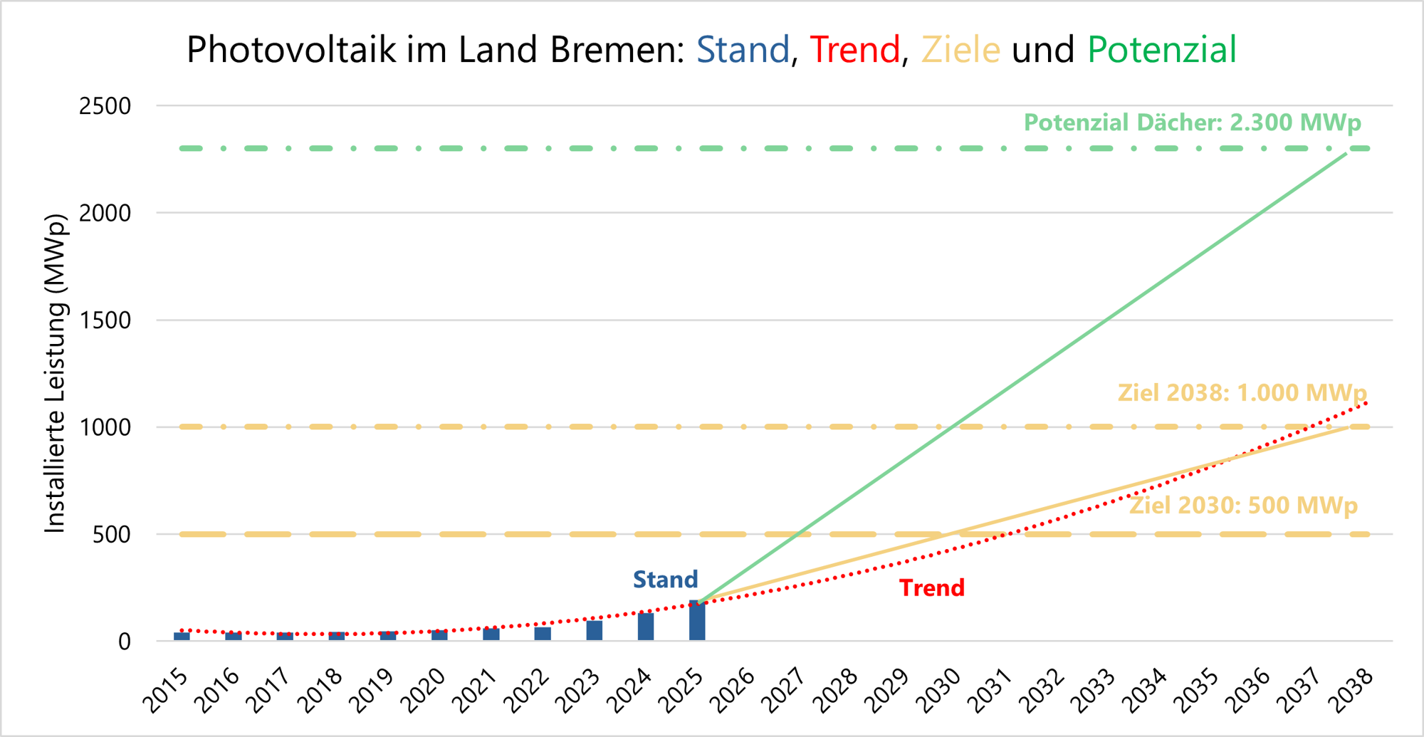 Bremen muss also sein Potenzial voll ausschöpfen. Das liegt bei Photovoltaik auf Dachflächen bei 2.300 MWp (Quelle: Agora Energiewende: Solarstrom vom Dach). Wir gehen also davon aus, dass eine installierte Leistung in dieser Größenordnung deutlich vor 2038 vorhanden sein muss, um Klimaneutralität bis 2038 zu erreichen. Dieser Wert ist oben in grün dargestellt. Die Bremer Senatorin für Umwelt möchte allerdings lieber eine eigene Potenzialerhebung durchführen: "Für das Jahr 2025 ist eine Erhebung der Solarpotentiale im Lande Bremen unter Beachtung der genehmigungsrechtlichen und gebäudetechnischen Voraussetzungen durch die Senatorin für Umwelt, Klima und Wissenschaft geplant. Aktuelle Daten zu einem Abgleich des erfolgten PV-Ausbaus zu den vorhandenen Solarpotentialen in der Freien Hansestadt Bremen liegen somit noch nicht vor." (siehe Vorlage 21/3923 für den KlimaControllingAusschuss am 14.01.2025, Seite 13). Ergebnisse sind uns bisher nicht bekannt.